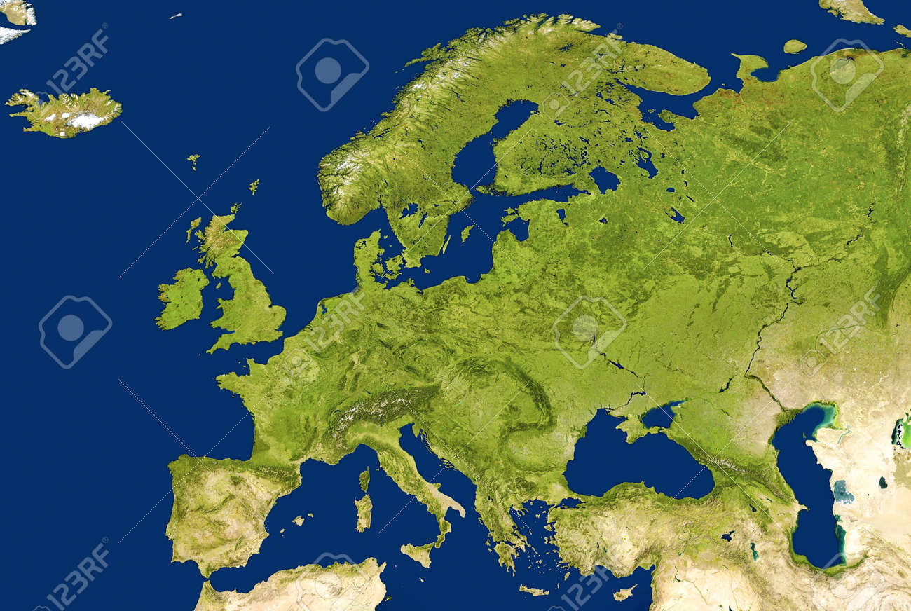 Europe Map In Global Satellite Photo, Flat View Of European Part
